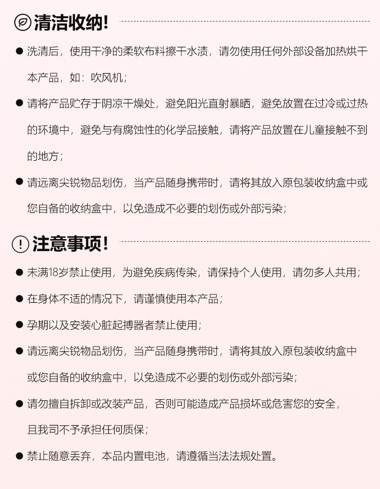 本网站所销售的产品均属于消耗品及个人私密使用之物品。为了保护您和其它消费者的利益,除产品明显缺陷以外,我们将无法退换购买的玩具和产品。在购买前请仔细阅读有关文字介绍,如有疑问,请及时和我们联系,我们将热情为您服务。如果您在商品使用中对商品质量或者商品使用方式有任何疑问,请直接联系我们的客服人员寻求解答。