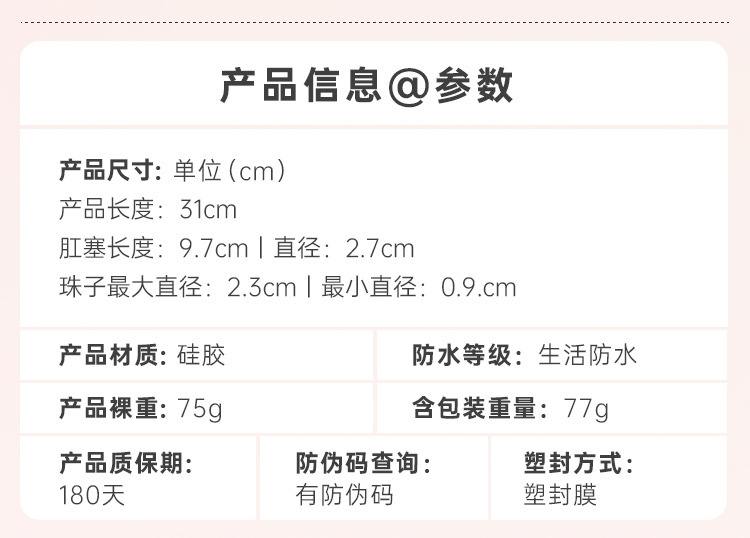 产品尺寸:长度31CM 肛塞长度9.7CM 珠子最大直径2.3 最小直径1.1