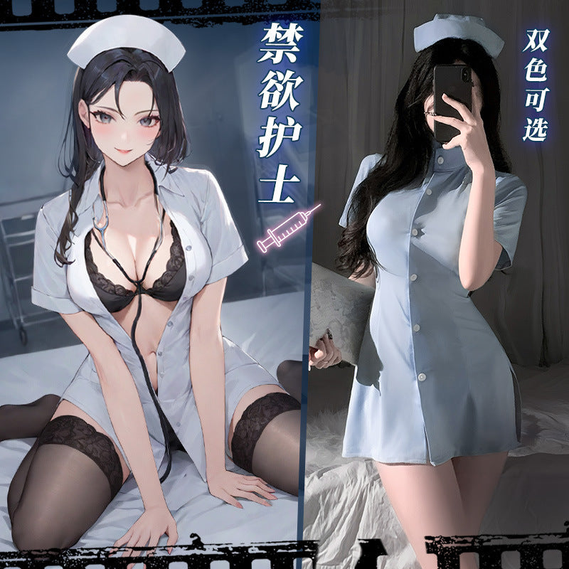 ◆夜勤护士◆白【护士帽+连衣裙】+黑文胸套装+黑吊带丝袜