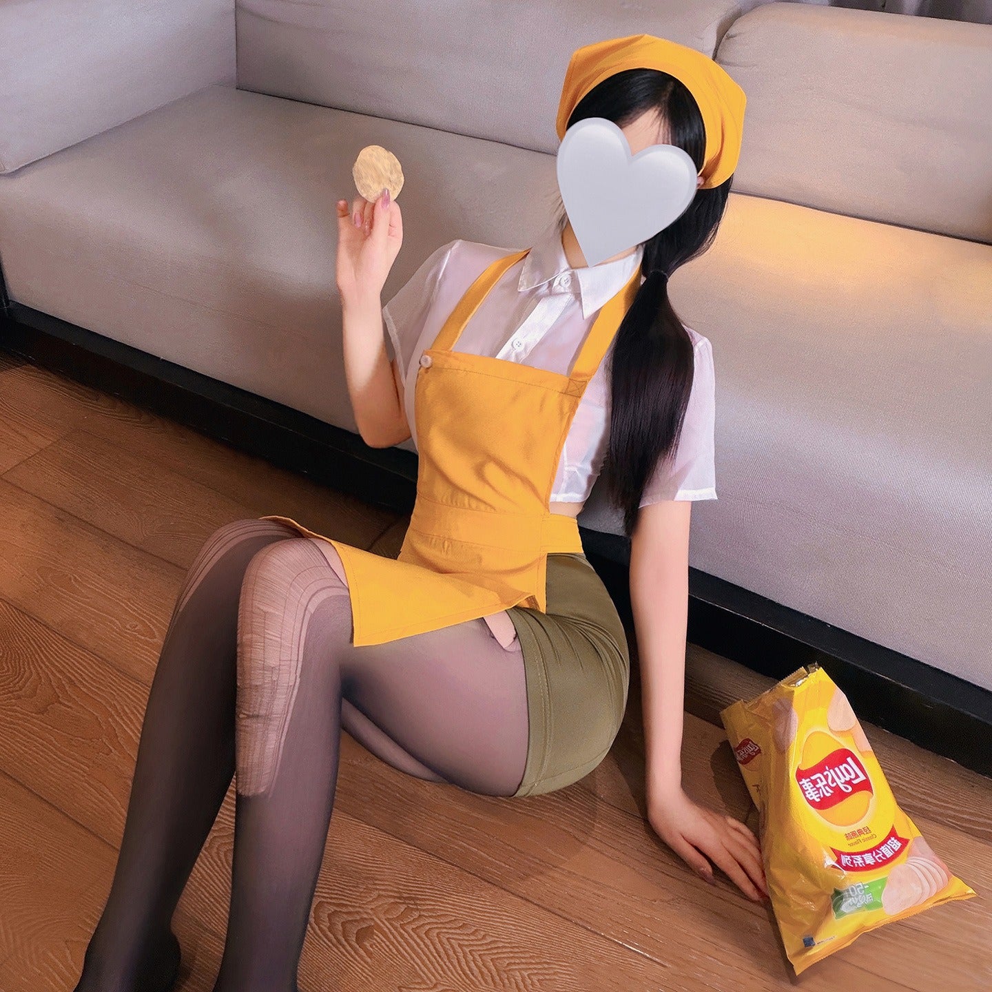 ◆情销店员◆黄+白【头巾+上衣+裙子+围裙+T裤】+黑手撕袜