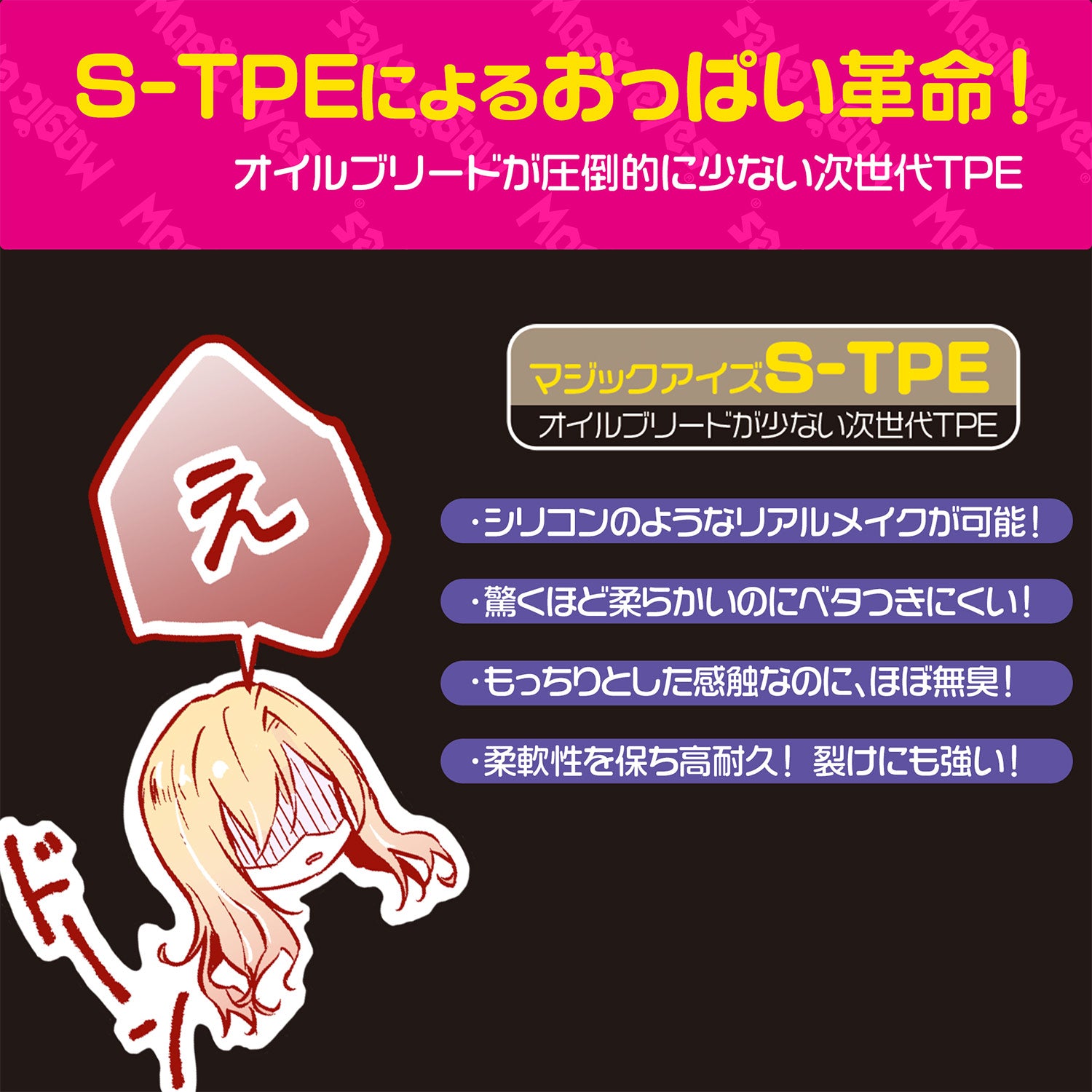 把Yuina的胸部触感与视觉细节做成可把玩的真实美胸玩具。这款玩具采用 Magic Eyes S-TPE 次世代材质与“真实皮肤妆”工艺,表层细节(肤理/质感)表现更逼真,手感软弹、可揉可捏,带来更沉浸的“2.5次元”体验。搭配随附的 A2 特大海报一起使用,氛围更到位,适合喜欢视觉代入与胸部触感玩法的用户。