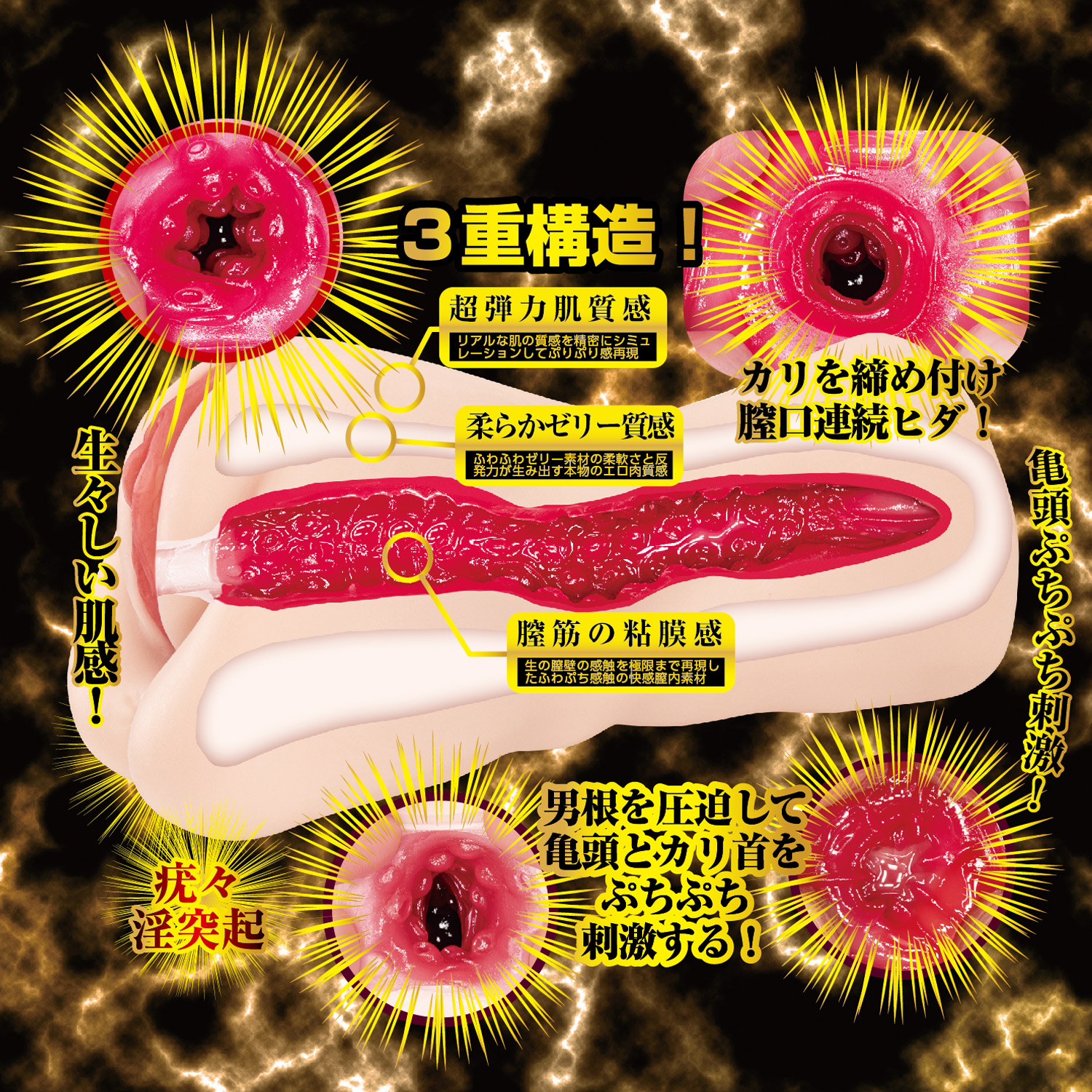 该倒模产品采用三层复合触感:外层强调真实肌肤弹润,中层呈现柔软果冻般的回弹,内层模拟贴合的粘膜触感;配合非贯通结构带来的真空吸附,在使用过程中更容易形成贴合包裹与“吸附紧致”的体验。内部设计加入连段颗粒/波纹刺激与纵向紧致通道,从入口到深处都有持续反馈,兼顾柔软与刺激的层次变化。