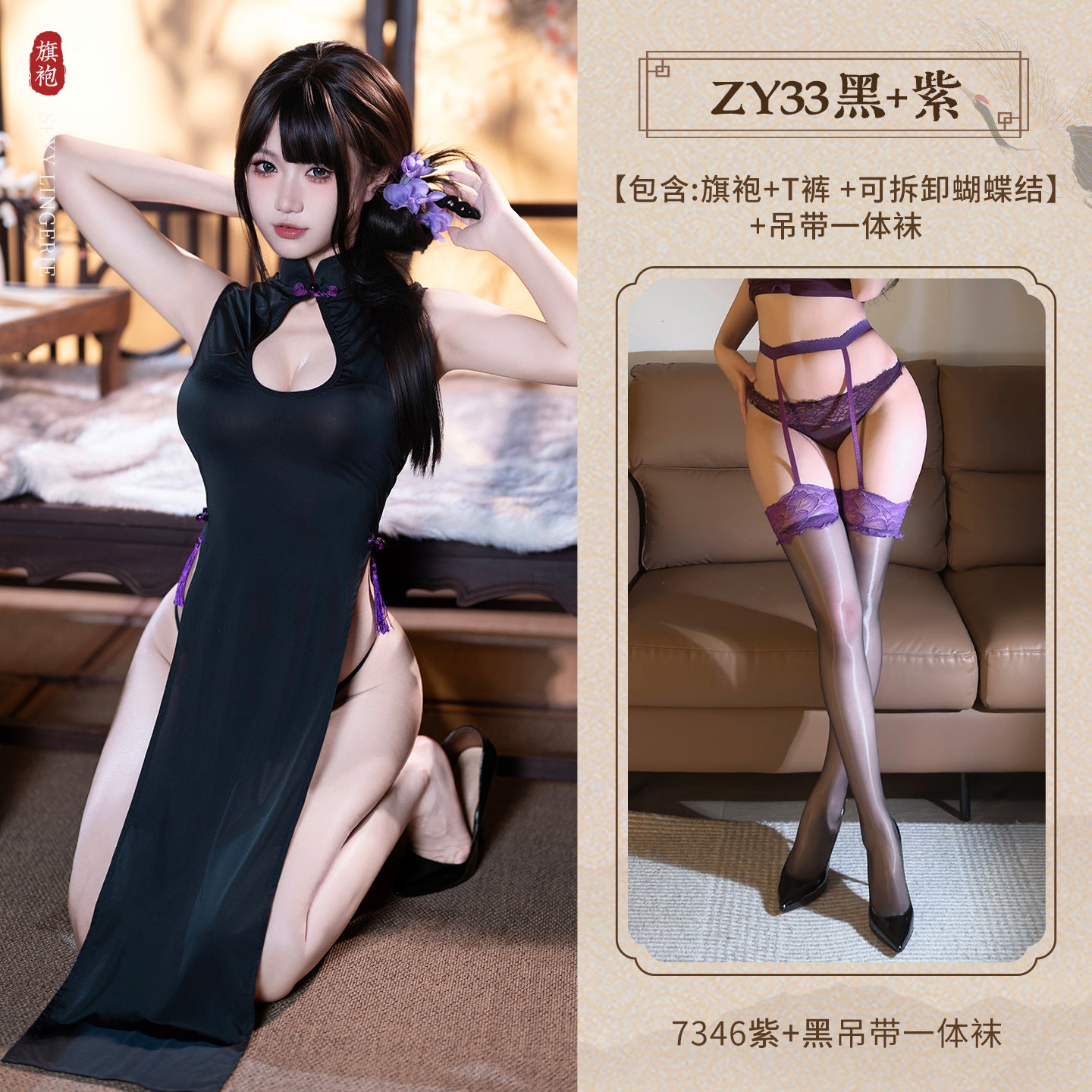 沦恋红尘 黑+紫【旗袍+T裤+可拆卸蝴蝶结】+紫黑吊带袜
