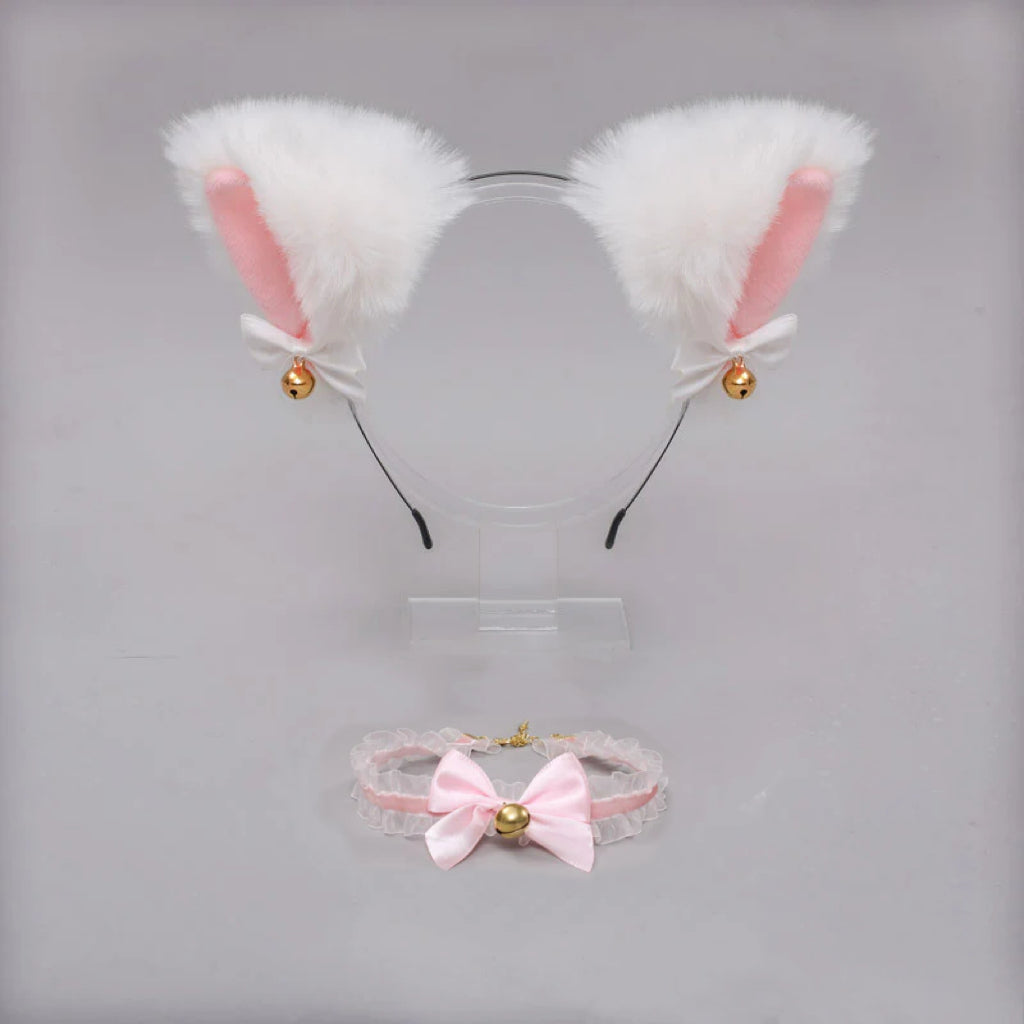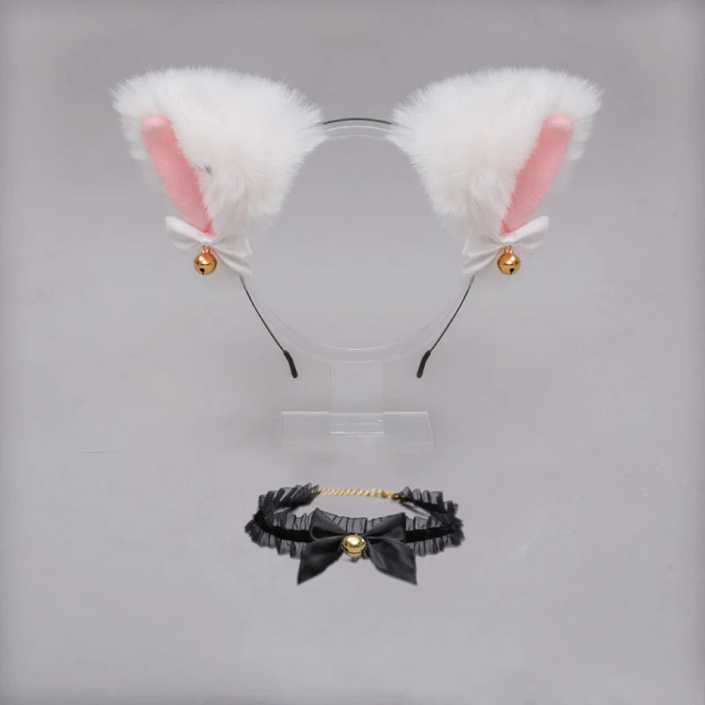 • 白毛发箍+白色蕾丝蝴蝶结脖铃