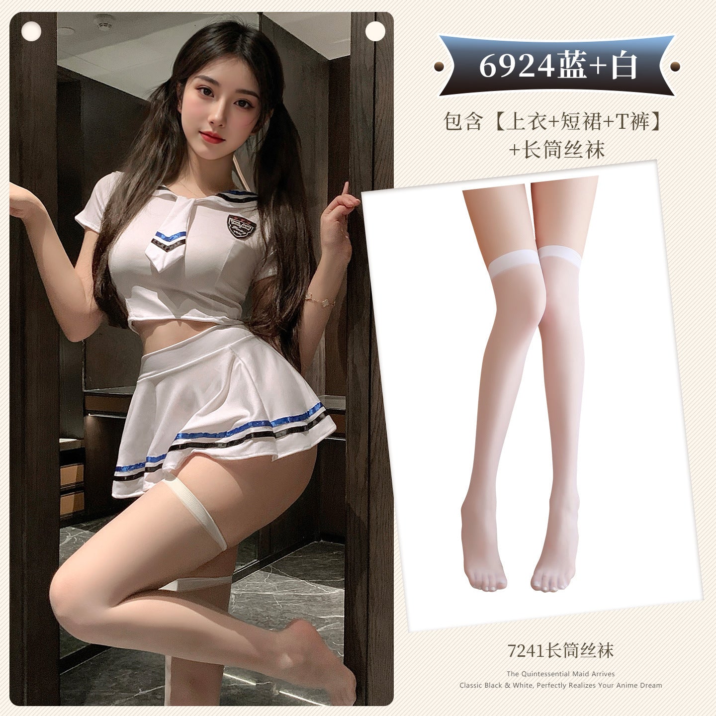◆纯白禁区◆白+蓝【上衣+短裙+T裤】+白长筒丝袜