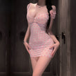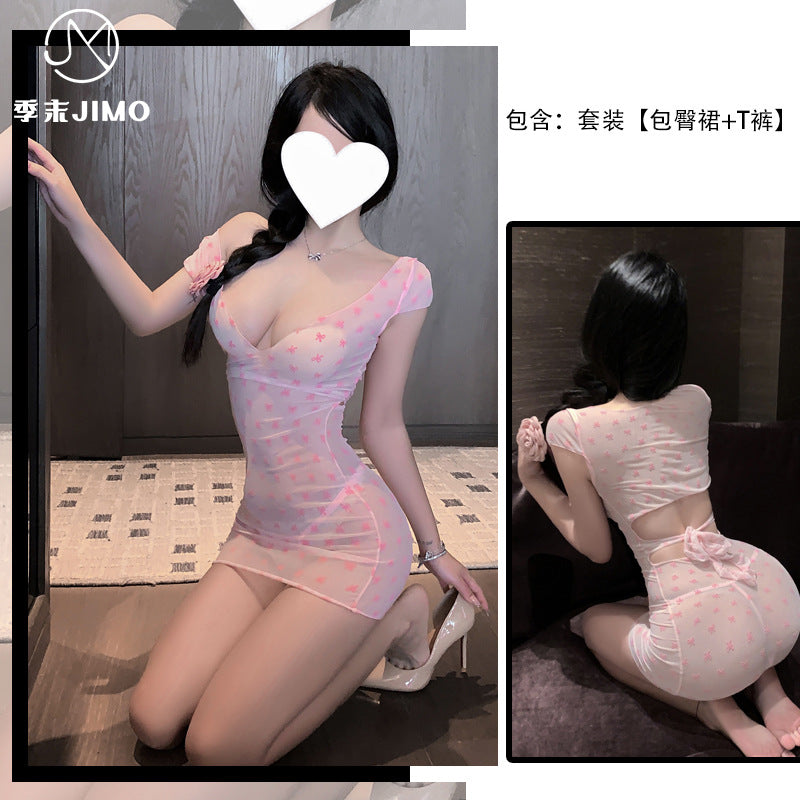 蜜桃陷阱 甜美透视缕空绑带蝴蝶结柔纱包臀睡裙