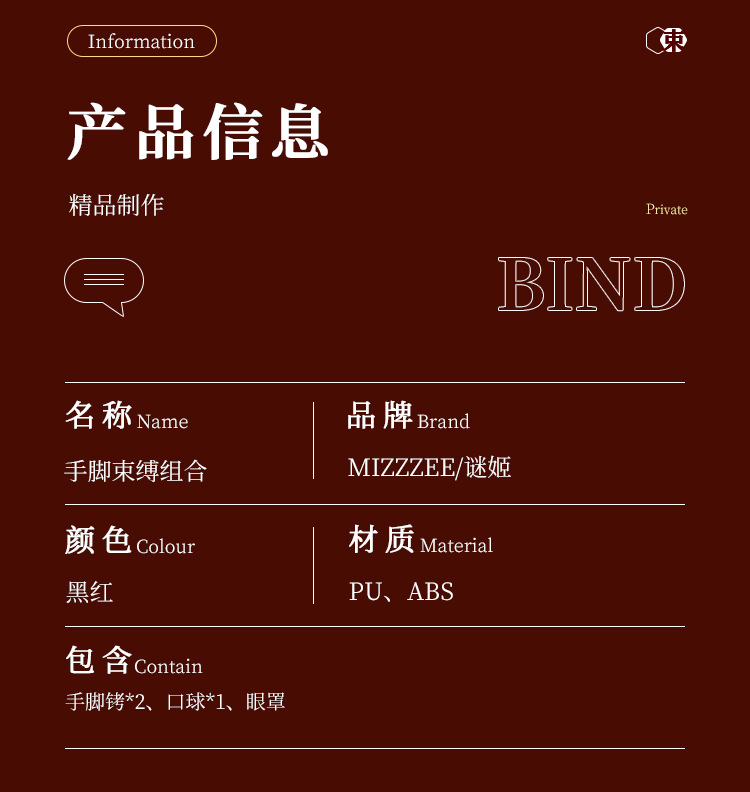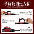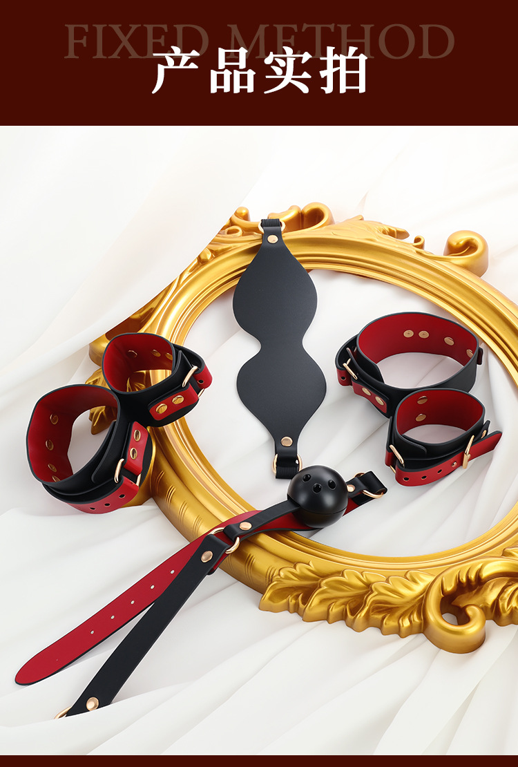 各配件及尺寸 :手铐宽4.5cm可调21-27cm,脚铐款4.5cm可调25-39cm,眼罩7*22.5cm,口球总长62cm