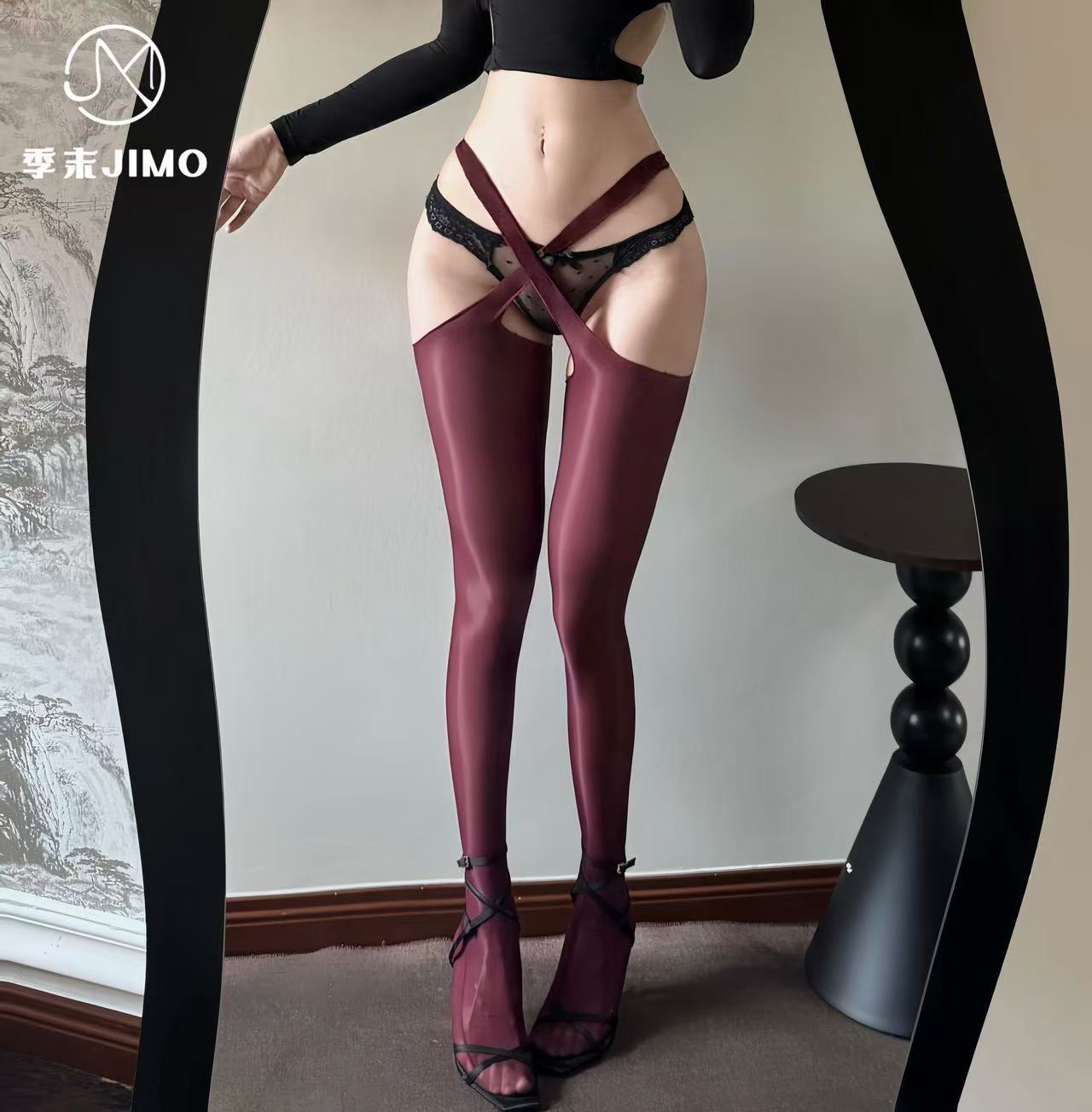 超薄面膜开档丝袜性感交叉连裤袜油亮黑丝镂空免脱