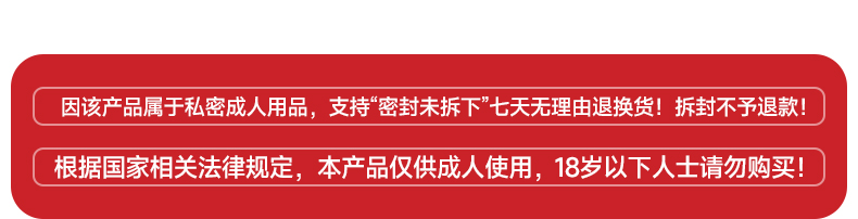 本网站所销售的产品均属于消耗品及个人私密使用之物品。为了保护您和其它消费者的利益,除产品明显缺陷以外,我们将无法退换购买的玩具和产品。在购买前请仔细阅读有关文字介绍,如有疑问,请及时和我们联系,我们将热情为您服务。如果您在商品使用中对商品质量或者商品使用方式有任何疑问,请直接联系我们的客服人员寻求解答。
